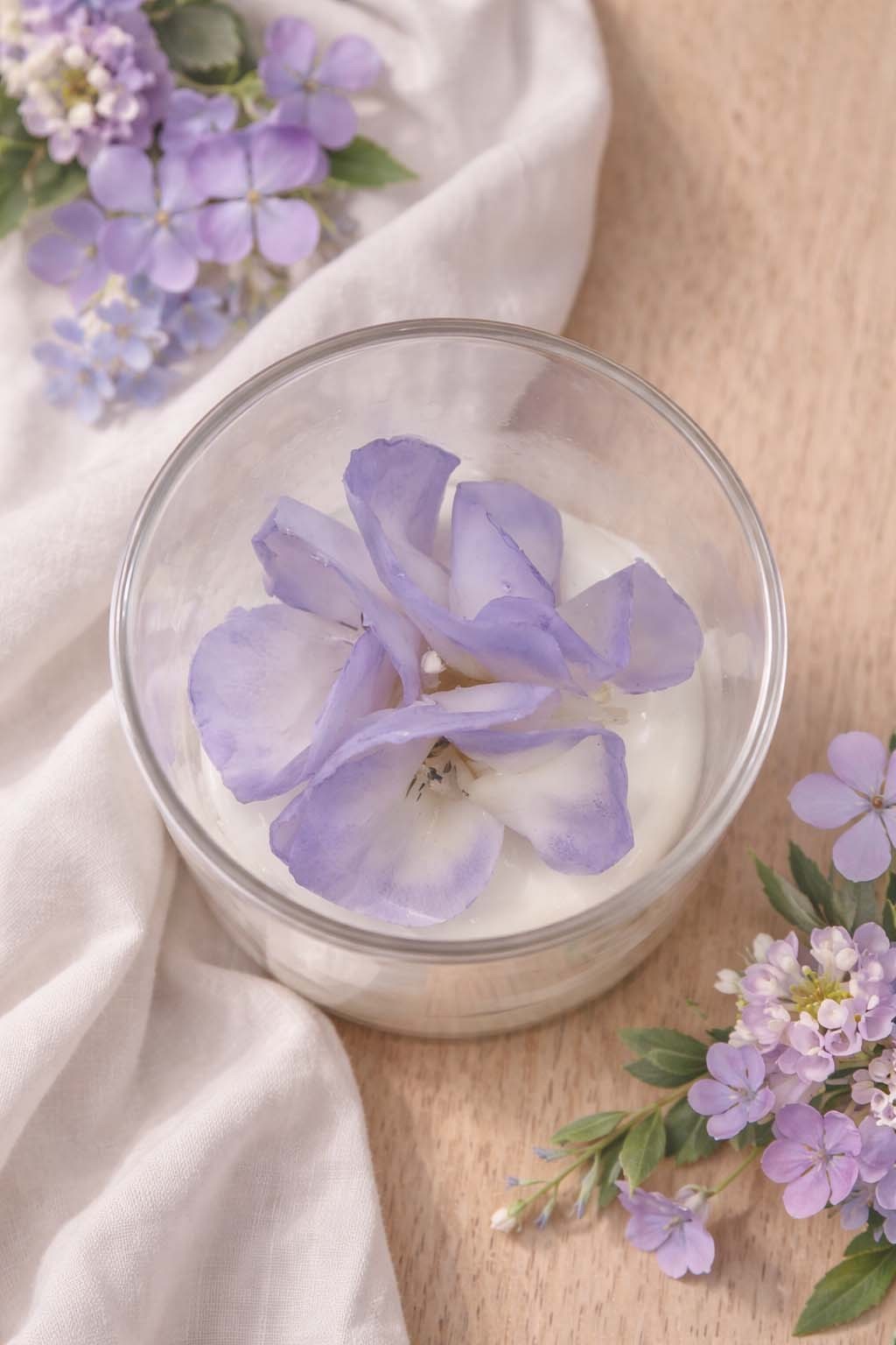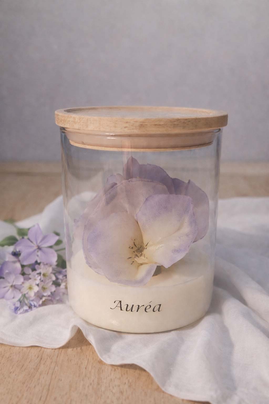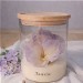 La fleur repose délicatement sur un lit de cire de soja, offrant une combustion douce et harmonieuse. Son contenant en verre, coiffé d’un couvercle en bois, sublime l’ensemble avec élégance et simplicité.