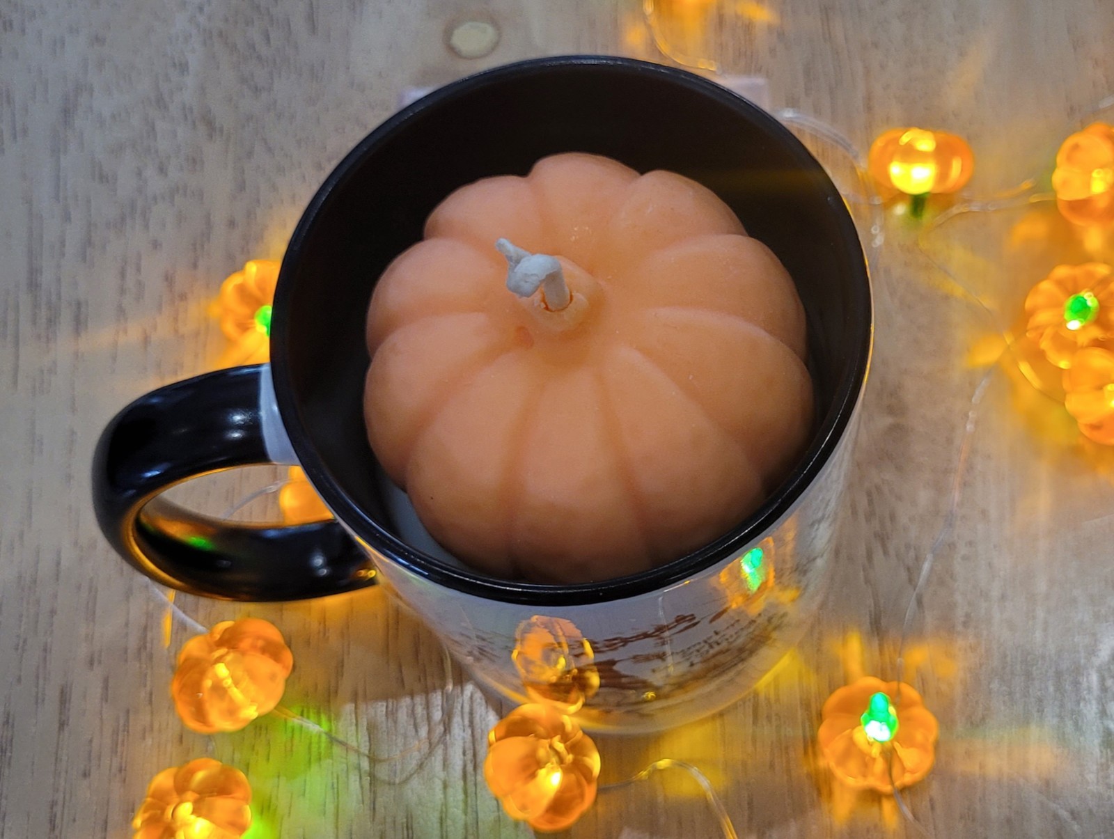 Adorables bougies citrouille dans de très jolis mugs d'automne.
